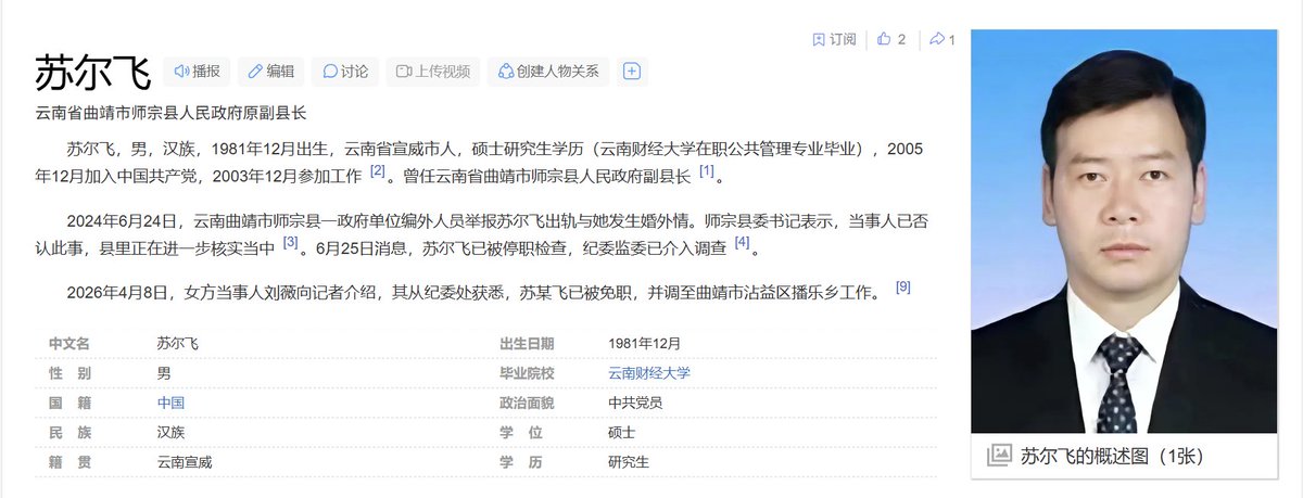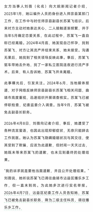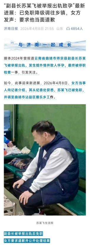 4月9日,据国内媒体报道,云南师宗县原副县长苏尔飞,当副县长期间,骗情人说自己单身未婚,之后把女生肚子搞大了,逼着她去堕胎,不同意就动手殴打,被免去副县长,降级调到乡镇任二级主任科员。