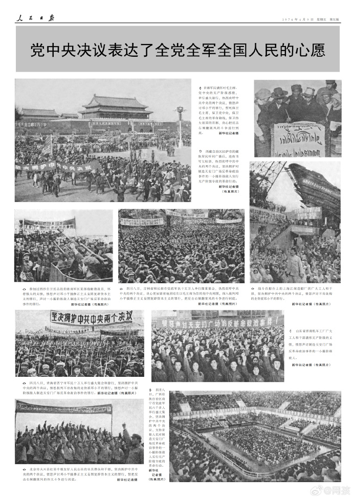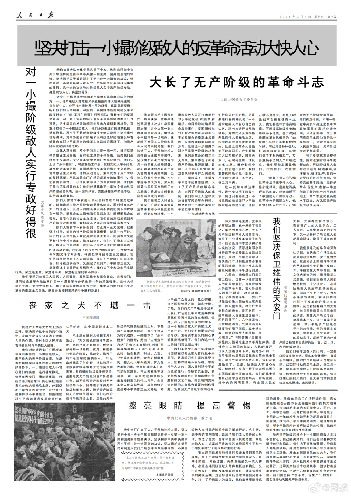 2版:党中央决定:华国锋同志任党中央第一副主席和国务院总理;撤销邓小平党内外一切职务 。批判邓小平和一小撮阶级敌人妄图颠覆无产阶级专政、复辟资本主义的罪行。如果让他们的阴谋得逞,我们就会重吃二遍苦,重受二茬罪。