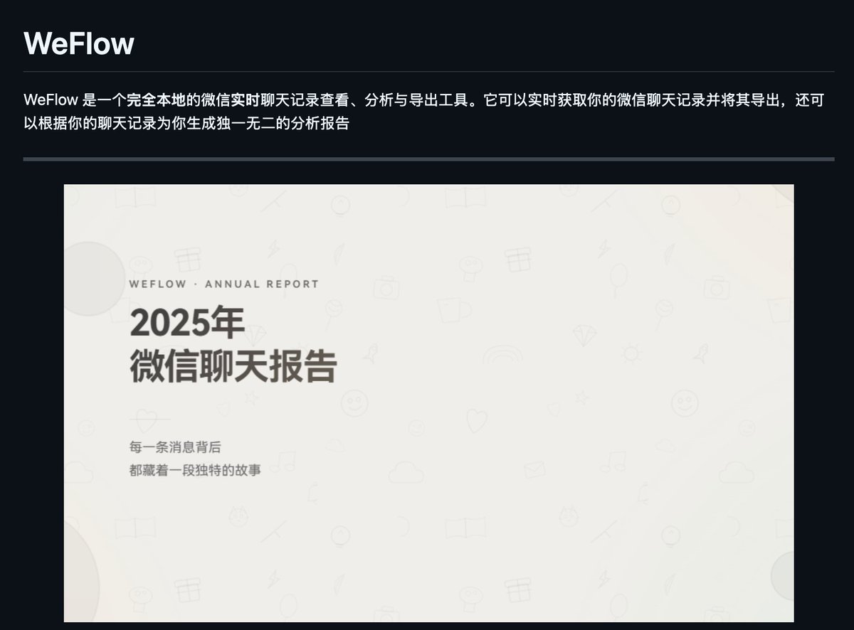 又发现一个牛逼的开源项目,可以直接实时获取微信聊天记录并导出,然后再去根据聊天记录生成分析报告。