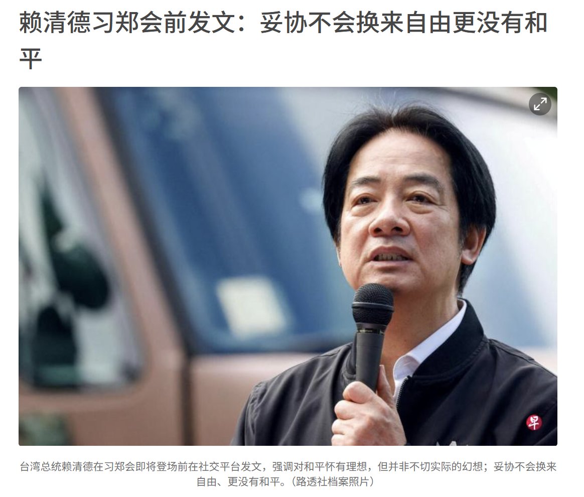 4月10日,郑习会前,赖清德在脸书发文强调:“我们对和平怀有理想,但并非不切实际的幻想;因为历史告诉我们,向威权者妥协,只是以主权与民主做代价,不会换来自由、更没有和平。”和平必须靠实力,而实力必须要靠长期稳健的投资;“我们更要展现自我防卫的决心,才能获得友盟的支持。”