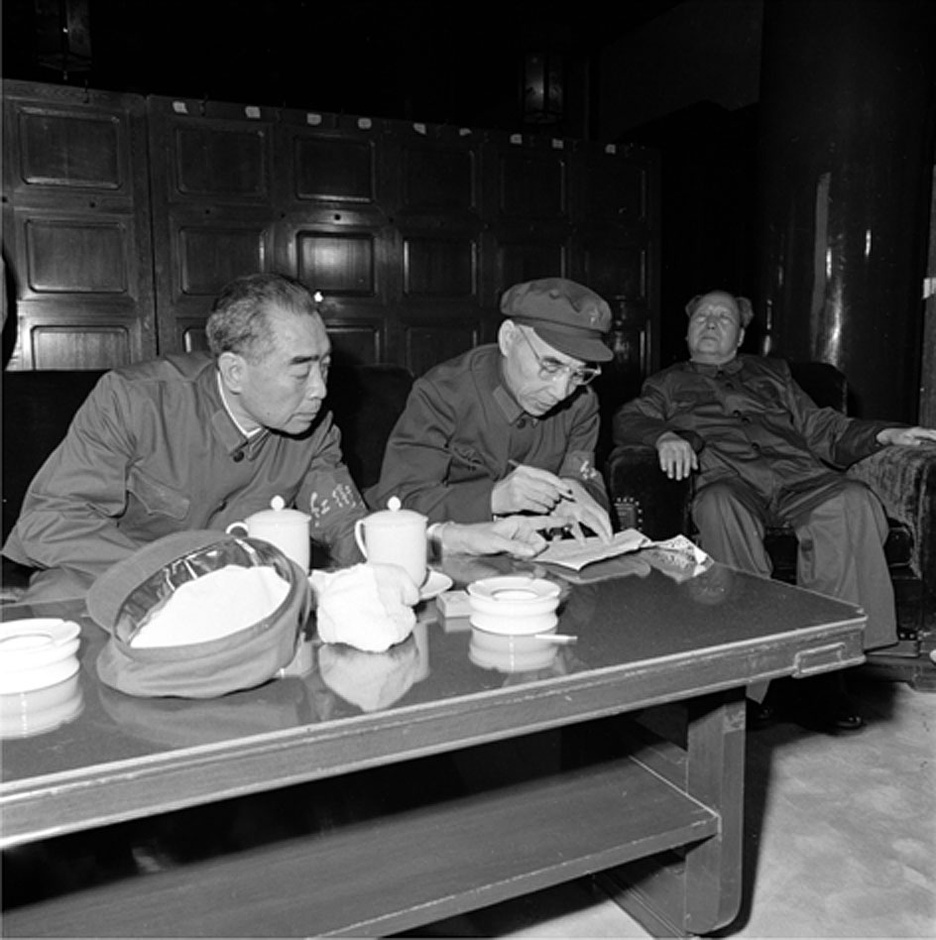 图:1966年9月15日,毛泽东、周恩来、林彪在天安门城楼休息室。