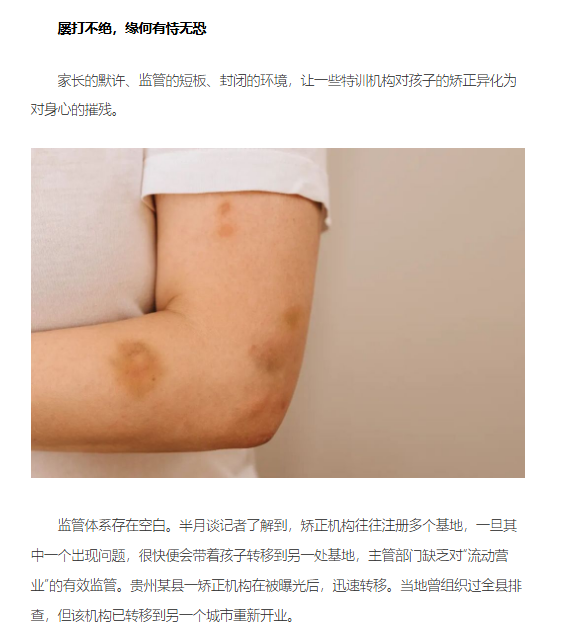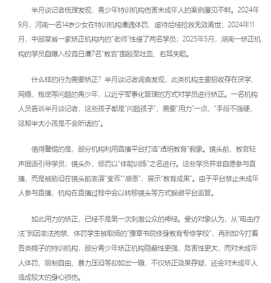 文章指出,部分打着“教育矫正”“行为矫治”等名义开展的项目,在宣传中呈现“转变显著”“效果良好”,但实际运作中却存在体罚、辱骂等问题,甚至出现“镜头前感恩、镜头外受罚”的现象。