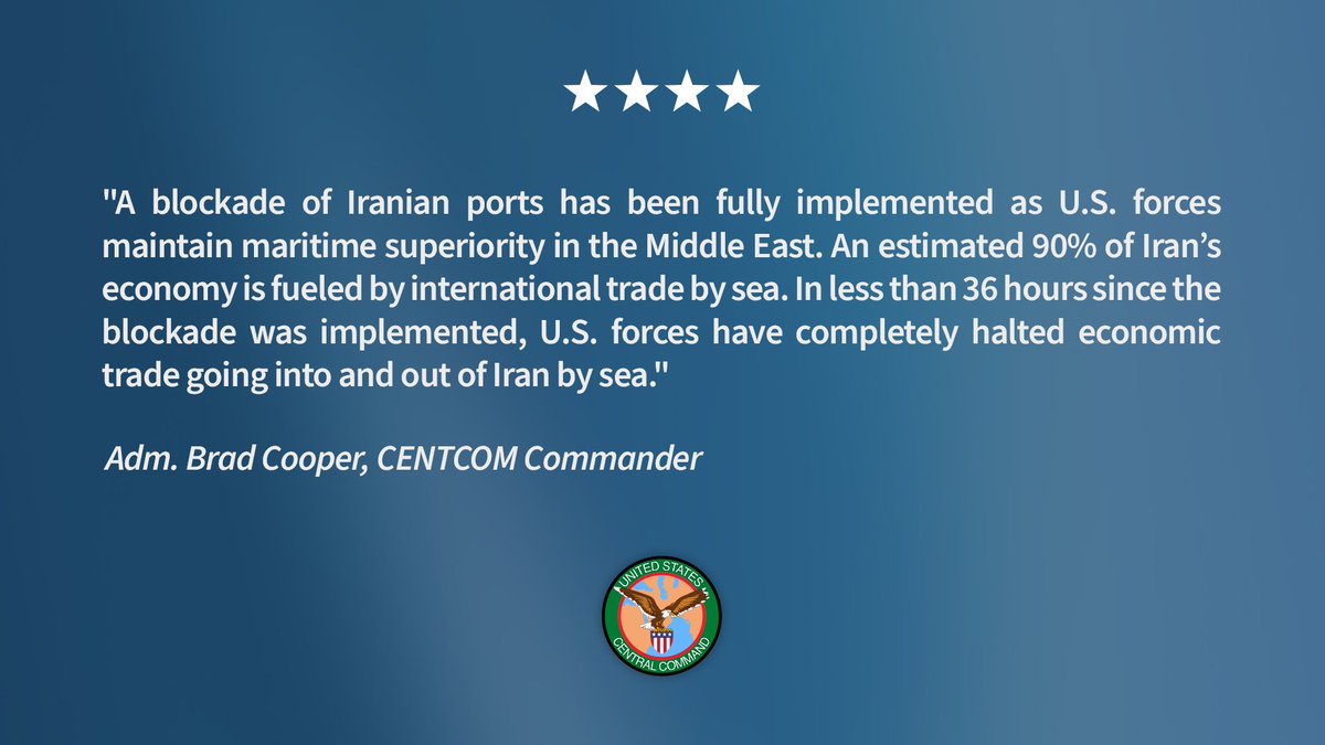 美军中央司令部布拉德·库珀上将:“美军已经完全切断了伊朗与外界之间的海上贸易往来。