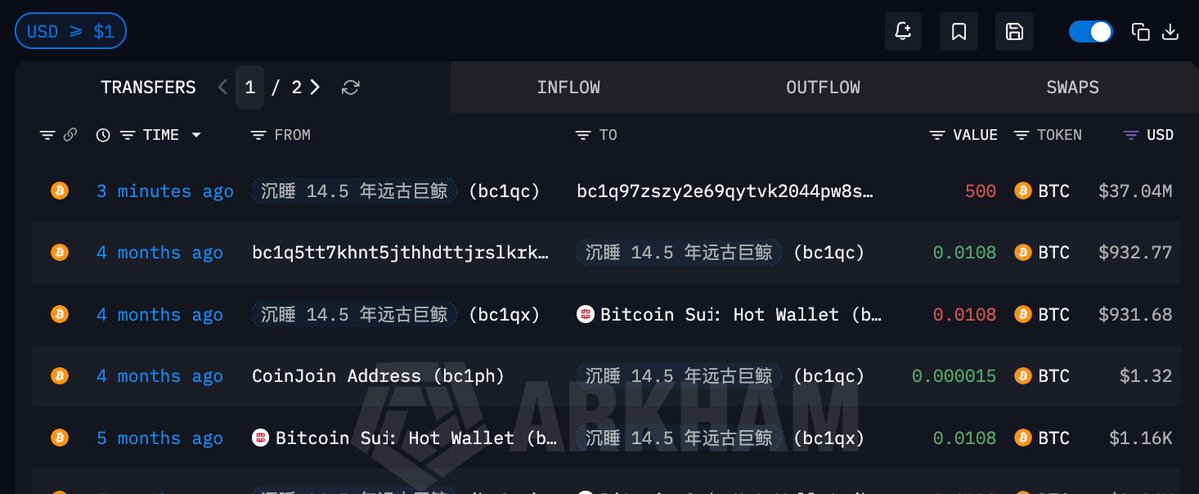 「沉睡 14.5 年持有 3000 $BTC 的远古巨鲸」时隔四个月再次苏醒!成本低至 0.37 美金🐋2 分钟前,他向新地址 bc1q9…h0s2j 转移了 500 枚 BTC,价值 3704 万美元,目前地址仍持有 2359 枚 BTC,价值 1.74 亿美元接收地址 bc1q97zszy2e69qytvk2044pw8swues6dnwqgh0s2j#Bitget VIP