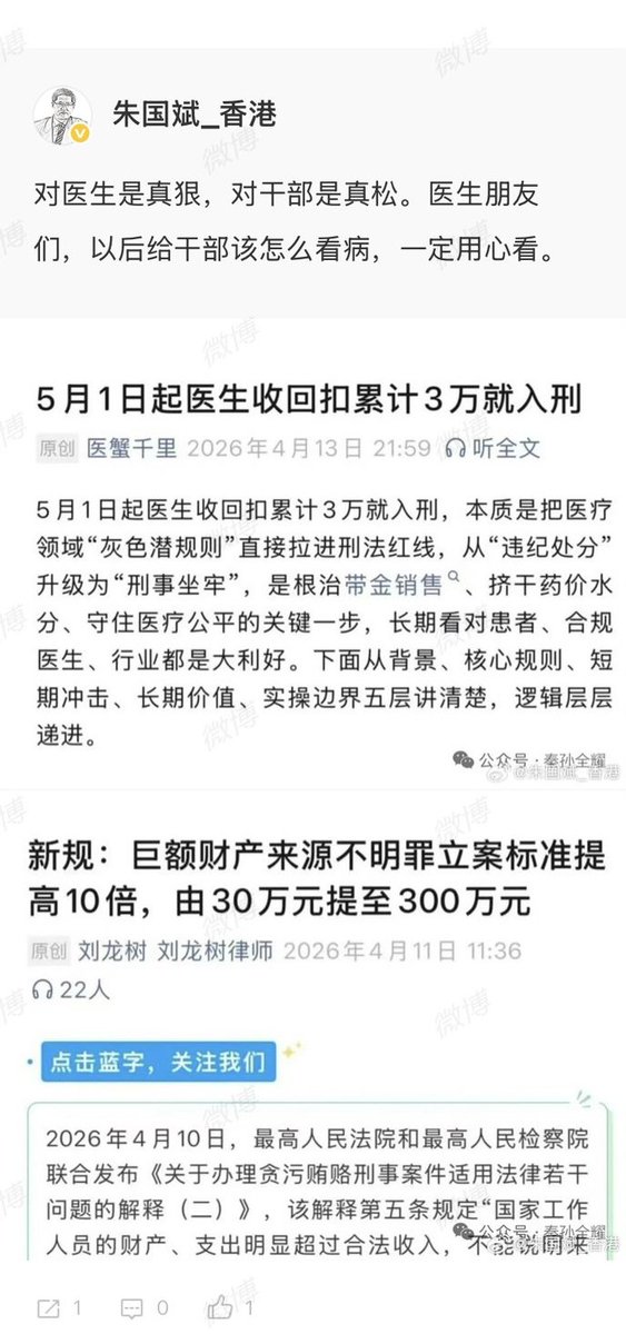 “巨额财产来源不明罪立案标准提高10倍,由30万提高至300万” 香港城市大学法律学院教授朱国斌表示:“对医生真狠,对干部是真的松。医生朋友们,以后给干部该怎么看病,一定用心看”