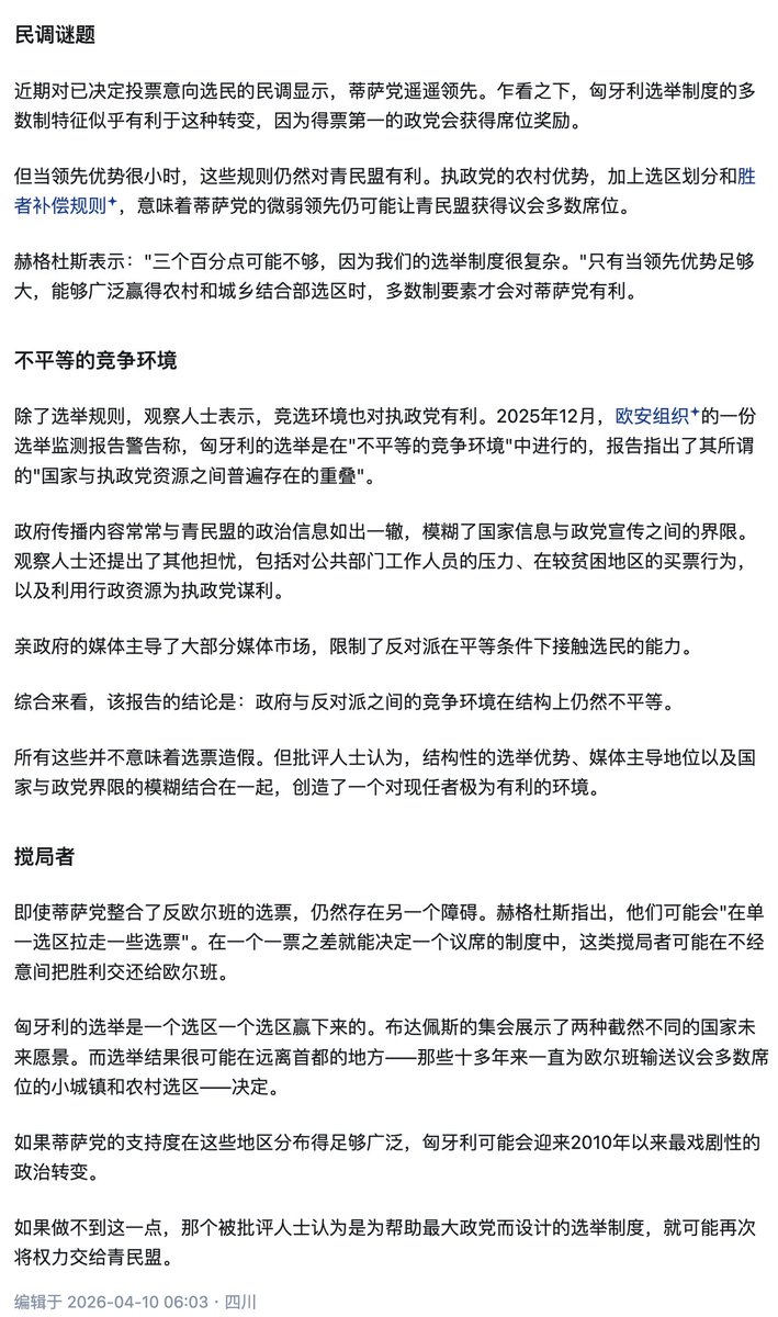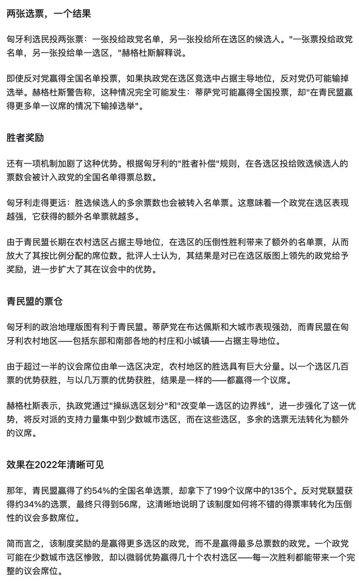 这次蒂萨党以54%的票拿到超过修宪门槛的议席就是这种制度的反噬现象。
