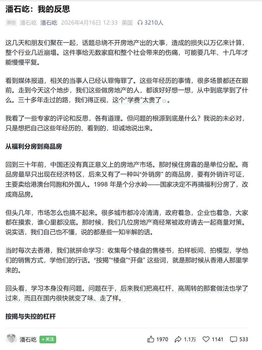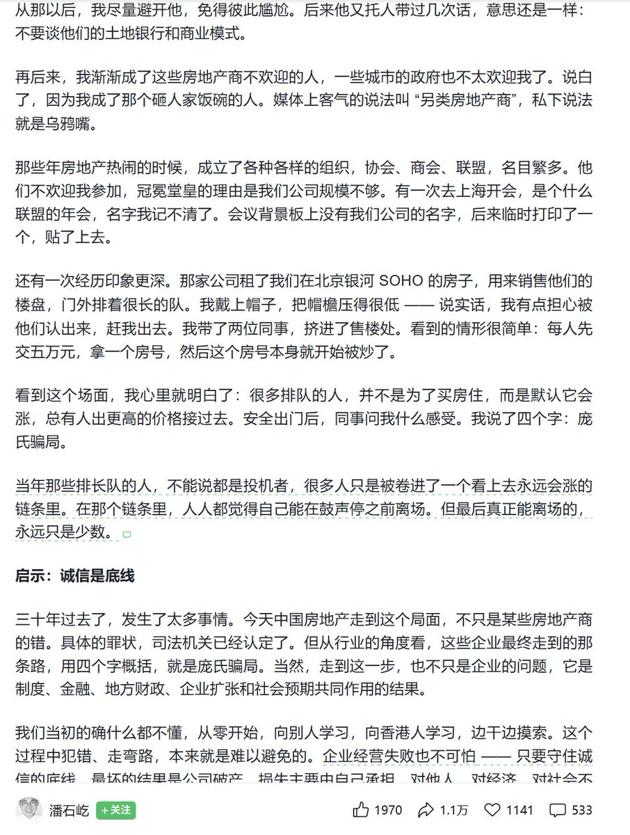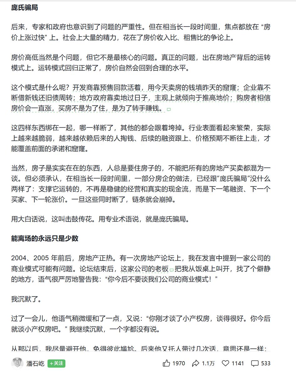 4月16日,潘石屹发表题为“我的反思”文章。他说,在相当长一段时间里,一部分房企的做法,已经跟“庞氏骗局”没什么两样了。用大白话说,这叫击鼓传花。用专业术语说,就是庞氏骗局。