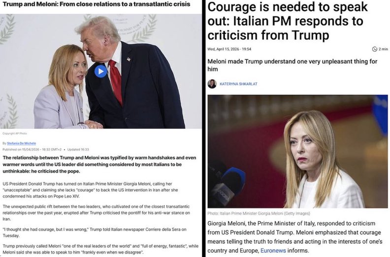 梅洛尼曾被视为特朗普在欧盟最亲密的盟友之一。然而,在梅洛尼为教皇辩护之后,特朗普竟声称她“不可接受”,且“缺乏勇气”。