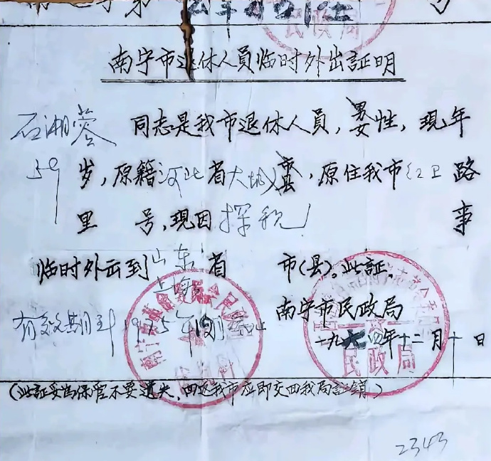 70年代,南宁市退休人员临时外出证明