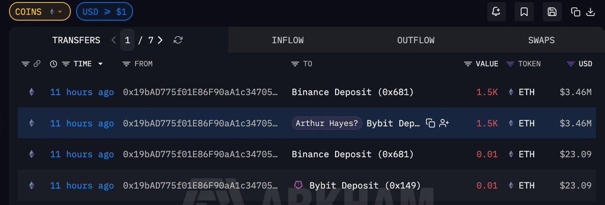 Arthur Hayes 关联地址 11 小时前向 #Binance 和 #Bybit 充值 3000 枚 $ETH ,价值 692.7 万美元该地址使用的 Bybit 充值地址也曾在一年前与 Arthur Hayes 存在交互;目前该地址仍持有 5278 枚 ETH,约 1233 万美元钱包地址#Bitget VIP