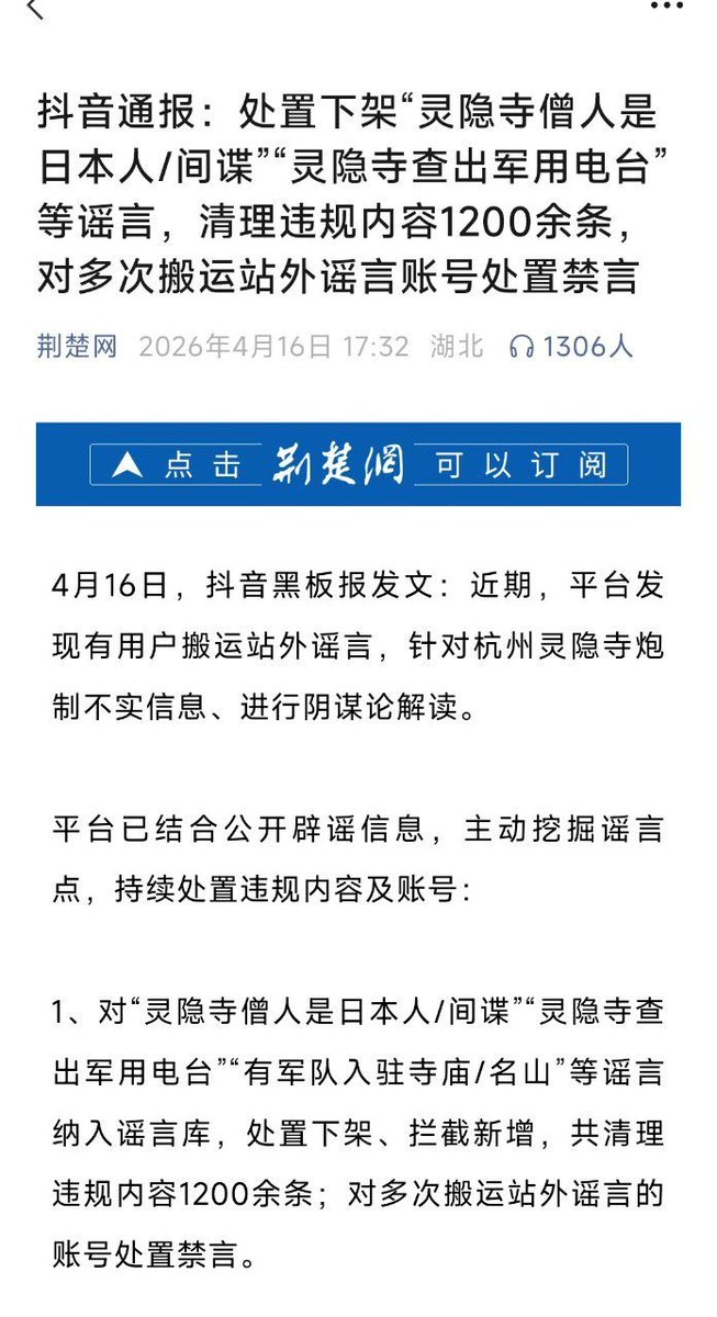 网友投稿:近日,杭州灵隐寺在互联网上陷入“抓间谍”的舆论风波。网传,寺里的僧人为“日本人/间谍”,而灵隐寺则为“间谍大本营”,被查出“军用电台”而后,抖音发布处置通告,称清理谣言、阴谋论违规评论18.7万条。
