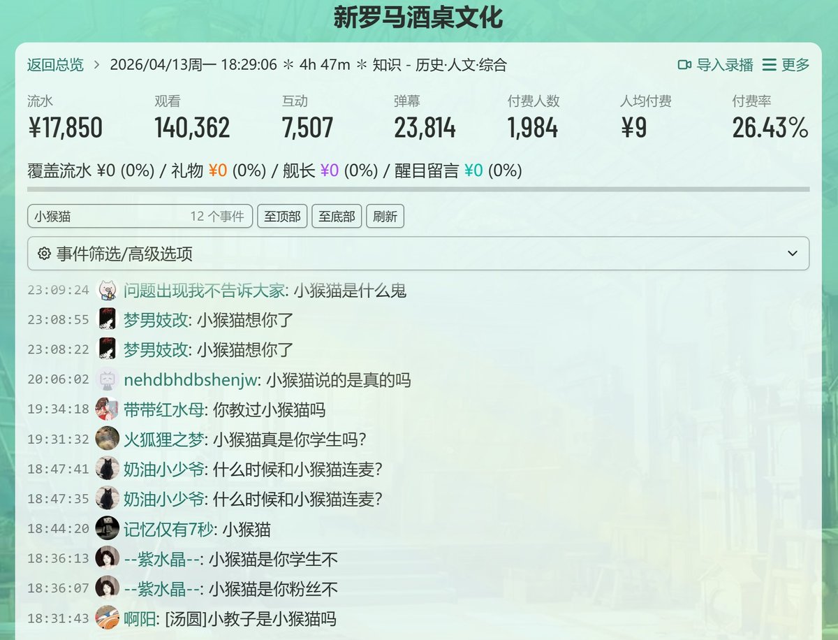 小猴猫捅出来他用北美大专肄业学历在深圳博纳学校当生物老师的事情后,好多人冲他直播间,不过一点没影响牢a编故事收割高纯度A粉,你看这观看数和流水收入,14万观看,块1万8的流水💰🤑🤔