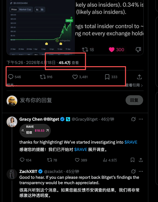 不到 5 个小时, @zachxbt 关于声讨 $RAVE 的帖子已经获得了 45 万的浏览,接近 1000 转发,3481 个赞以及大量声援。
