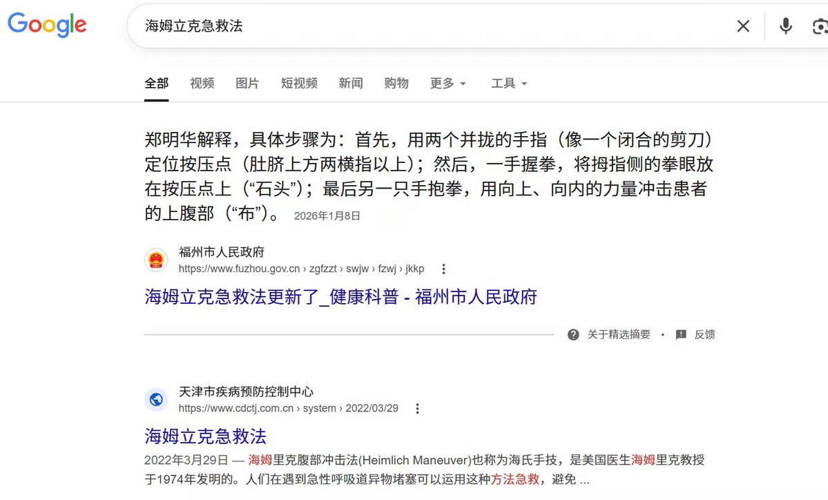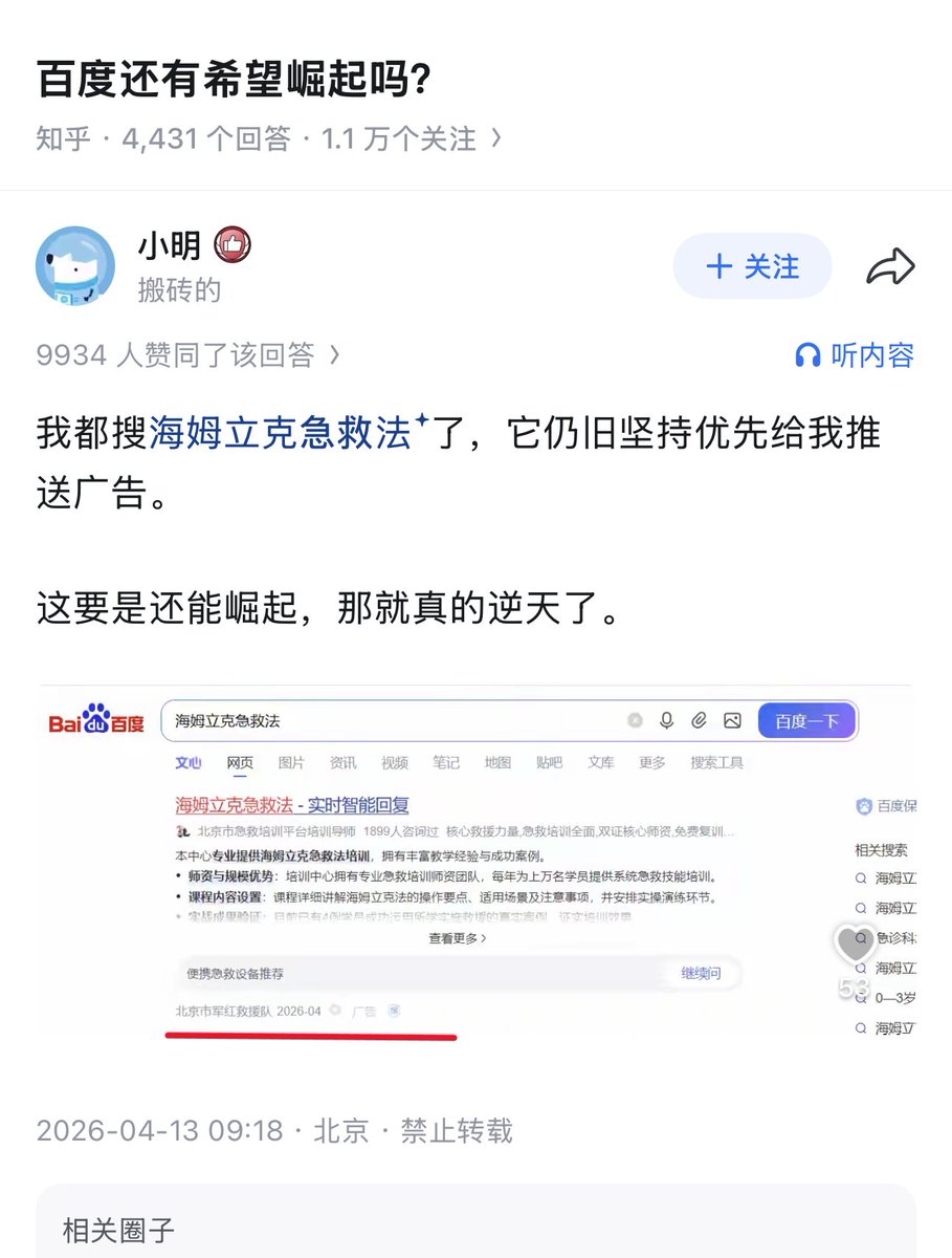 知乎上有人问:百度还有希望崛起吗? 一名知乎网友回复:“我都搜海姆利克急救法了,但它仍坚持优先给我推送广告” 评论区有人测试后发现,不止是百度,用360搜索引擎搜“海姆利克急救法”最上面的结果同样全是广告。 而谷歌搜索第一条结果就直接告诉你具体的操作方法 网友们对此表示:“如果真有人需要急救的时候,看到这些广告得有多么绝望啊!” “我用百度搜海姆利克急救法,它让我先做个一个ppt”