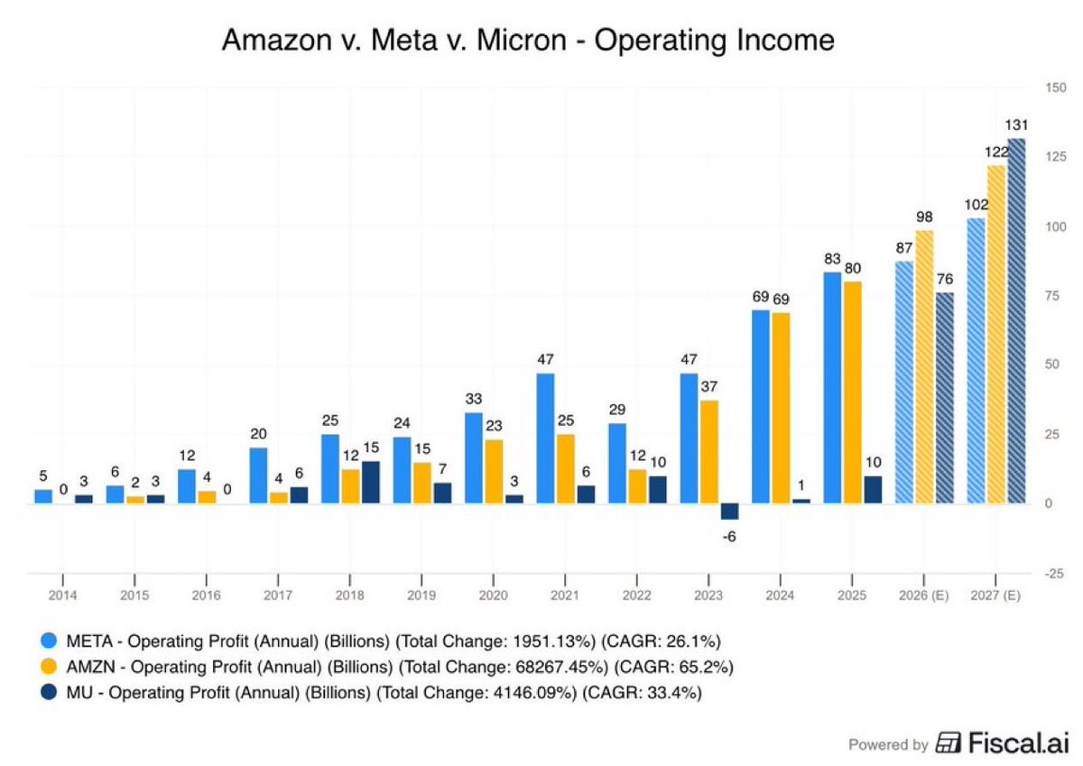 MU运营收入将在2027年超过亚马逊,甩过Meta?