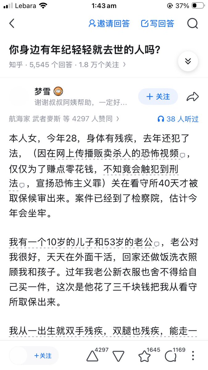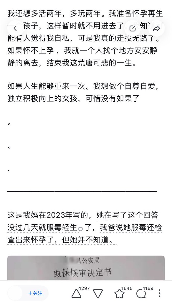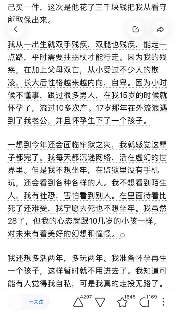 今年在知乎看的最惨的一个故事。。。 残疾人,没有收入,在网上卖小视频赚钱(涉恐涉爆猎奇视频),结果被晶哥逮捕,看守所待了四十几天,由于是残疾人,在看守所行动不方便,拉屎拉一裤裆,被羞辱,在看守所待了四十多天,绝食,被强行喂食,然后老公给她取保候审。 然后听说案子到了检察院,怕坐牢,写下这个回答。 三年后儿子找到妈妈手机,在这个原回答后面补充说明,说妈妈在写下那个回答后就服毒自杀了。死的时候怀有身孕。 一个字,惨。。。