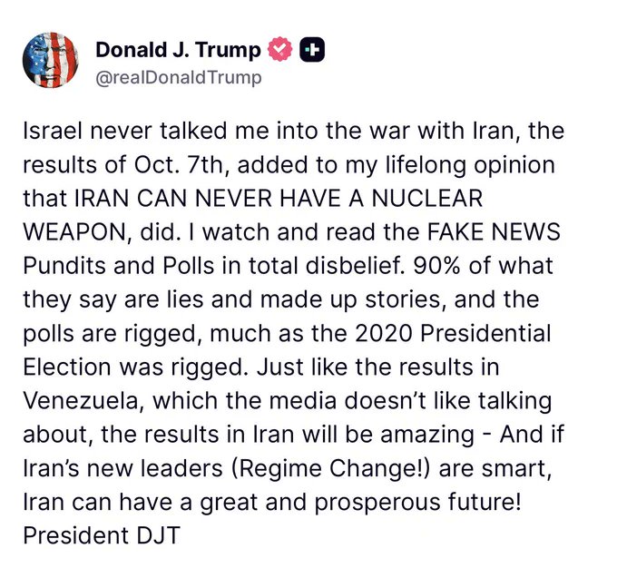 川普发文否认受以色列游说而对伊朗开战,称是"10月7日"事件的后果加上他长期以来的立场——"伊朗绝不能拥有核武器"——促使他作出决定。他抨击主流媒体报道90%都是谎言,民调遭到操纵,并将伊朗局势与委内瑞拉相提并论,暗示伊朗将发生政权更迭,并称若伊朗新领导层足够明智,该国将迎来"美好繁荣的未来"。