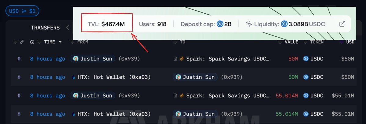 拉存款这件事,得孙哥者得天下,Spark 赢麻了😂 昨晚发完推后孙哥又从 #HTX 提出了一笔 5000 万枚 USDC,即 8 小时前累计向 Spark 存入 1.05 亿枚 USDC,加上此前的 53665 枚 ETH,总价值高达 1.74 亿美元 Spark 目前 USDC 存款池 TVL 为 4.67 亿,孙哥一个人的资金就占了近 22.5% #Bitget VIP 费率更低,福利更狠!买美股秒级入场
