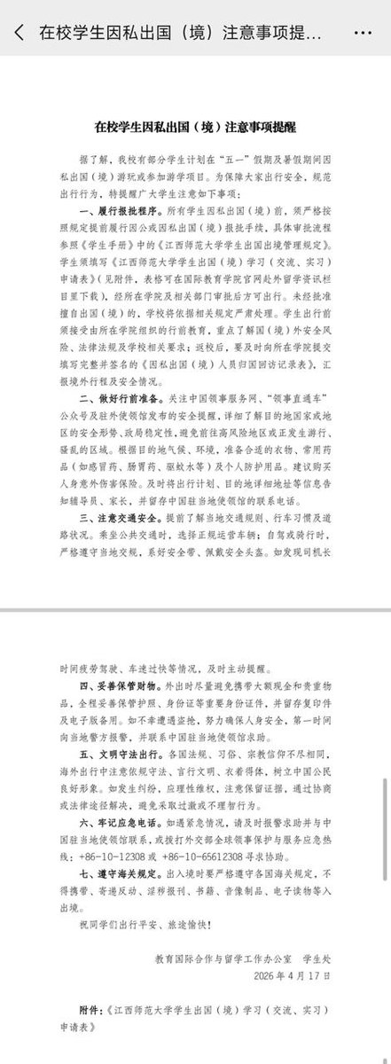 网友投稿:4月17日,江西师范大学,学校强制要求以后所有出国(境)的学生,无论是因公还是旅游,都要填写申请表,并且得到学校的层层审批才能通过,否则将会被处分。申请表中很多栏目已经严重侵害了学生的隐私权。