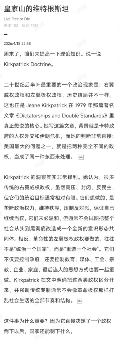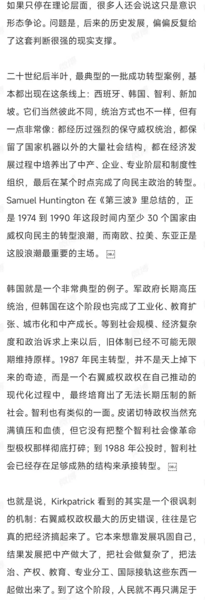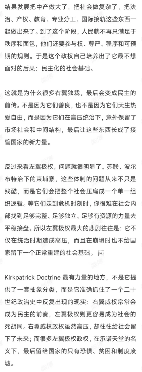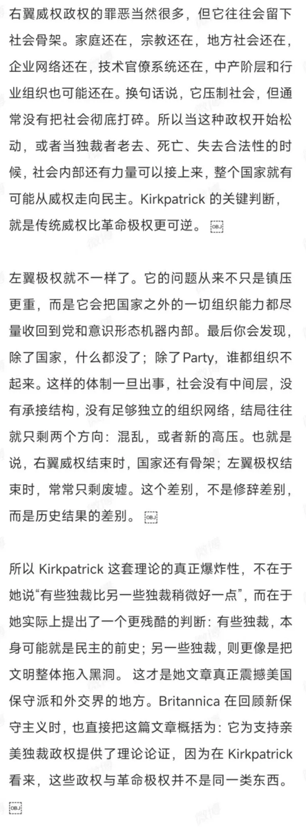 Kirkpatrick:右翼威权和左翼极权的不同,为什么有一些亲美独裁国家会转型为民主政权?而同样的情况少见于左翼极权国家?